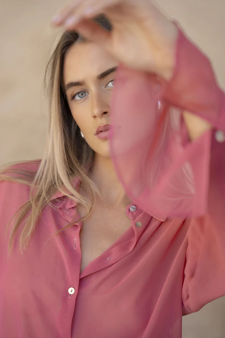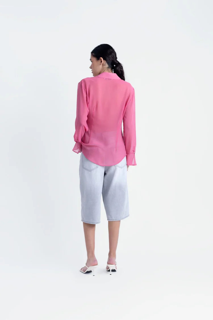 La Camisa de Gasa de la colección Otoño-Invierno 2025 es pura ligereza y sofisticación. Su tejido transparente y delicado acaricia la piel con suavidad, creando un efecto etéreo y femenino. Perfecta para aportar un toque romántico y elegante a cualquier look, esta prenda fluye con gracia, envolviendo la silueta con un encanto irresistible.