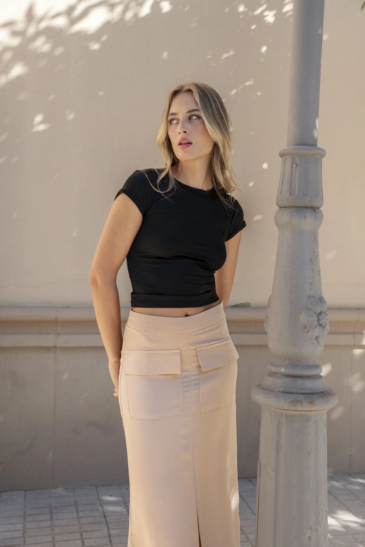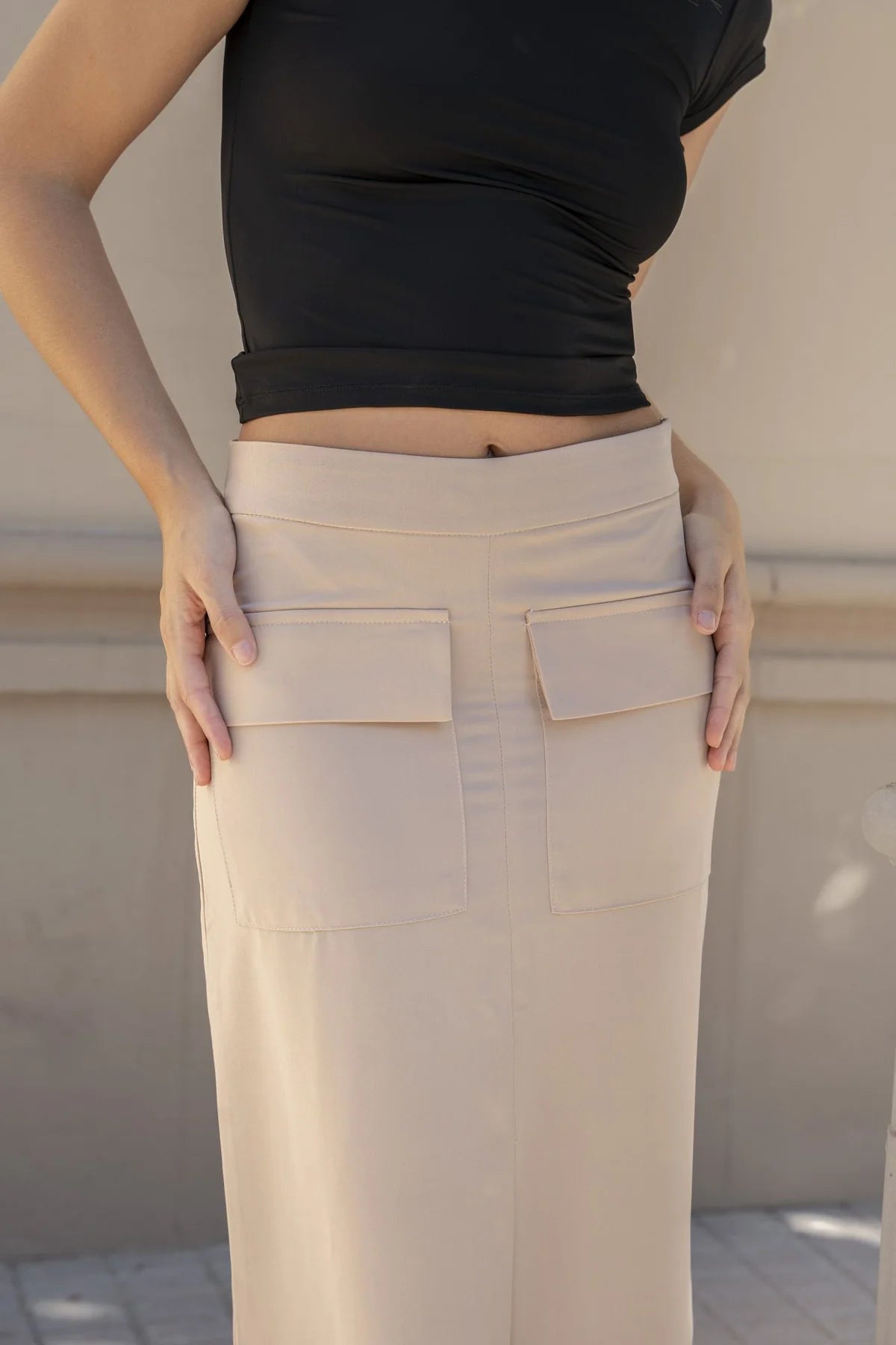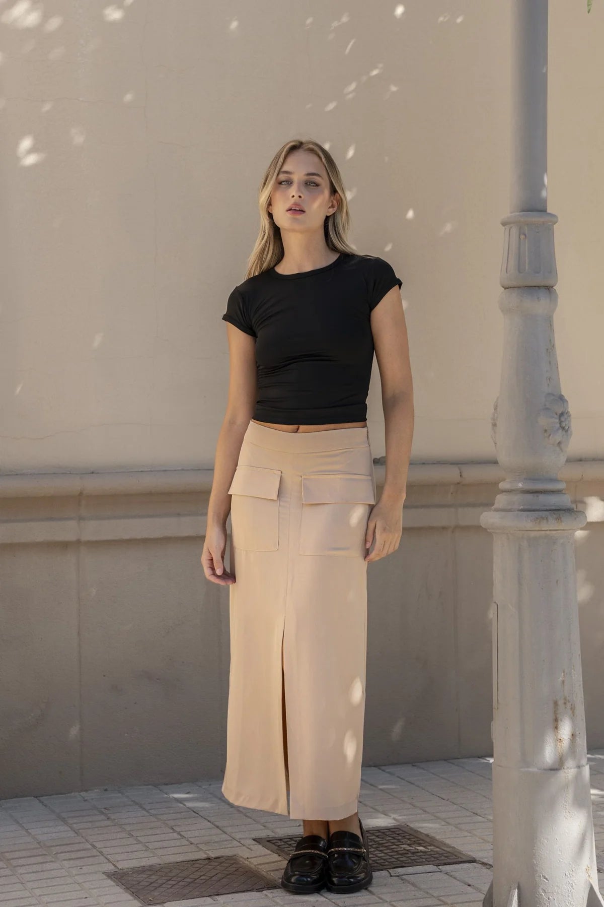 La falda midi cargo une la fuerza del estilo moderno con un toque de romanticismo sofisticado. Su corte elegante resalta la silueta, mientras los detalles cargo añaden carácter y encanto desenfadado. Cómoda y versátil, acompaña cada paso con libertad y elegancia, convirtiéndose en la aliada perfecta para un otoño e invierno con personalidad y estilo.