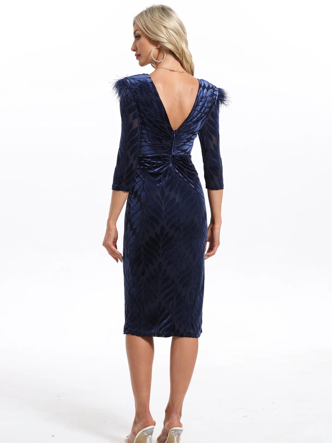 Descubre la magia del terciopelo texturizado: resalta los brillantes que acarician la piel y las plumas sutiles en los hombros para un toque romántico. El corte ajustado, escote cruzado y abertura frontal acentúan tu silueta con elegancia. Ideal para noches invernales y recepciones donde tu belleza y distinción serán inolvidables.