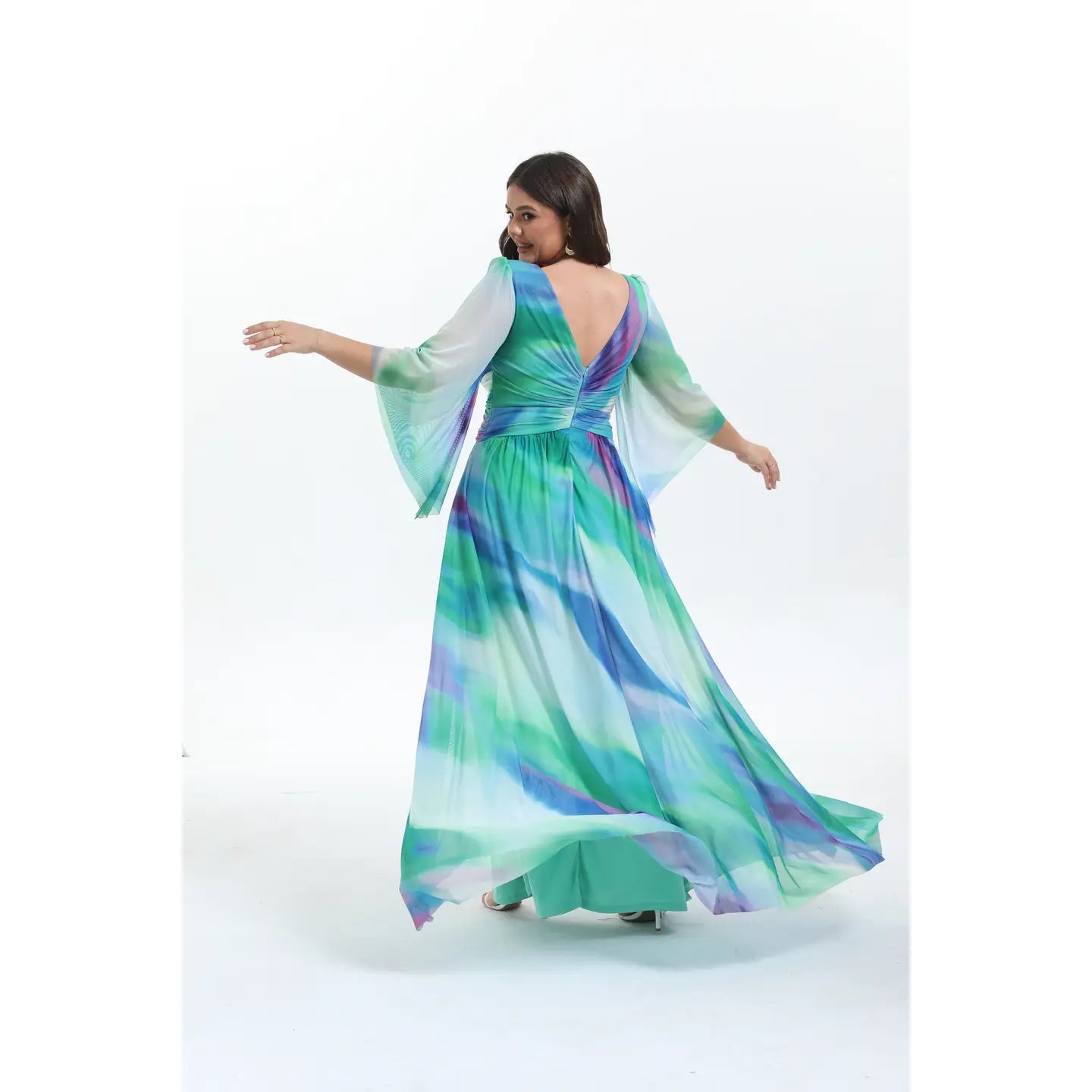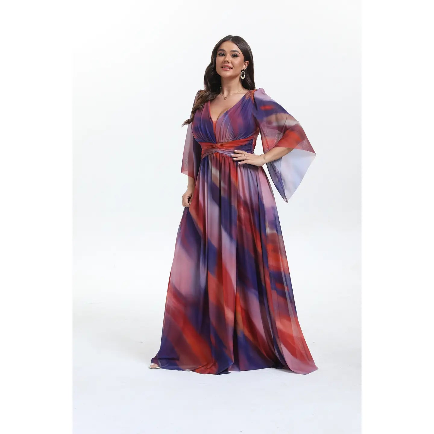 Este vestido largo celebra tu feminidad con un encanto bohemio y romántico. Sus mangas acampanadas fluyen con movimiento, mientras el escote y la abertura lateral envuelven tu silueta con sensualidad delicada. La cintura ajustada realza tus curvas con gracia, y su tejido elástico ofrece comodidad perfecta. Ideal para deslumbrar con estilo único en cada ocasión especial.