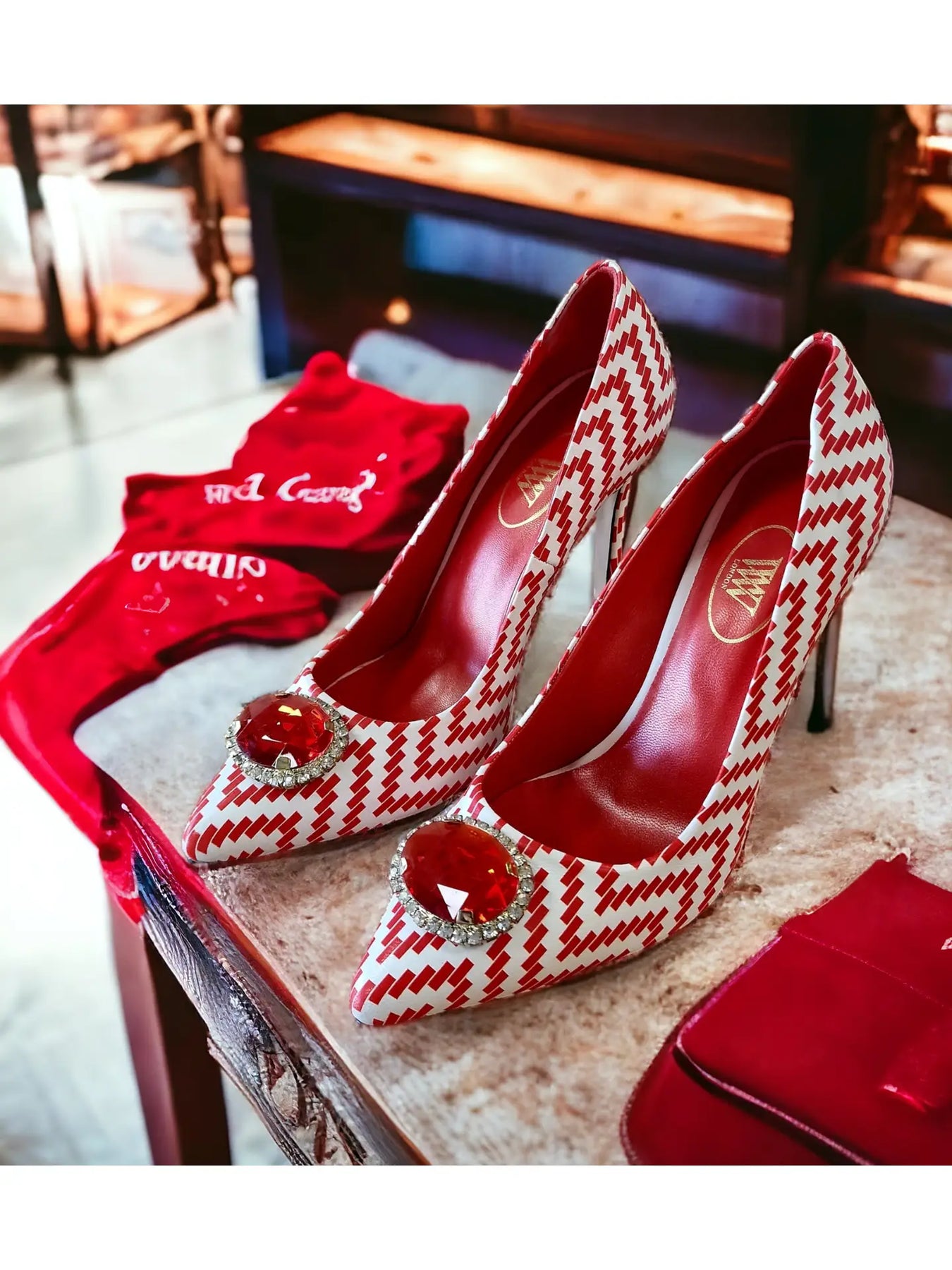 Haz una declaración de estilo con estos sofisticados tacones de aguja en piel con estampado de rayas rojas. Confeccionados en piel de alta calidad, su diseño de punta fina y tacón alto realza la silueta, mientras el adorno a juego aporta un toque exclusivo y elegante. Ideales para ocasiones especiales o elevar cualquier outfit, combinan moda y personalidad. Fabricados en Reino Unido, ofrecen confort, distinción y versatilidad, convirtiéndose en el complemento perfecto para un look llamativo y refinado.