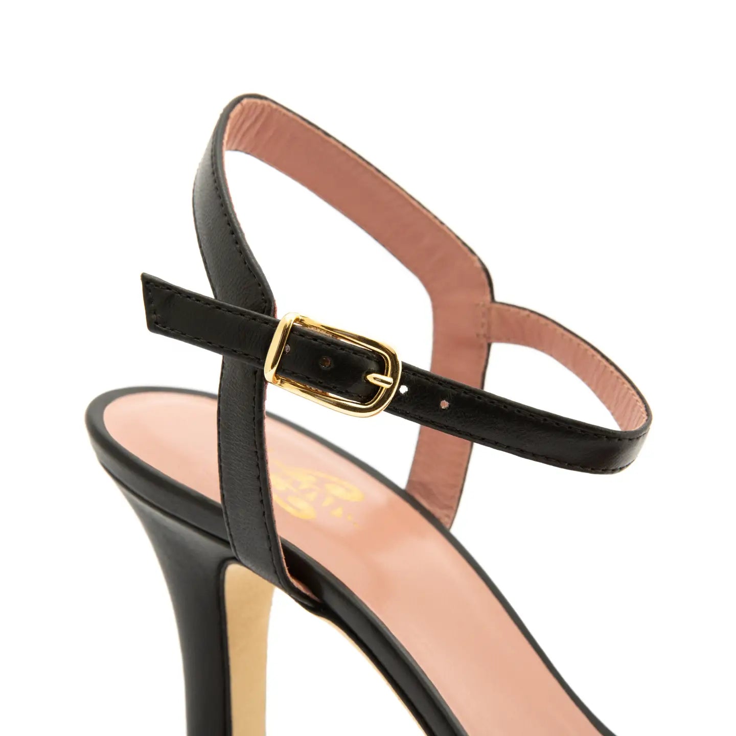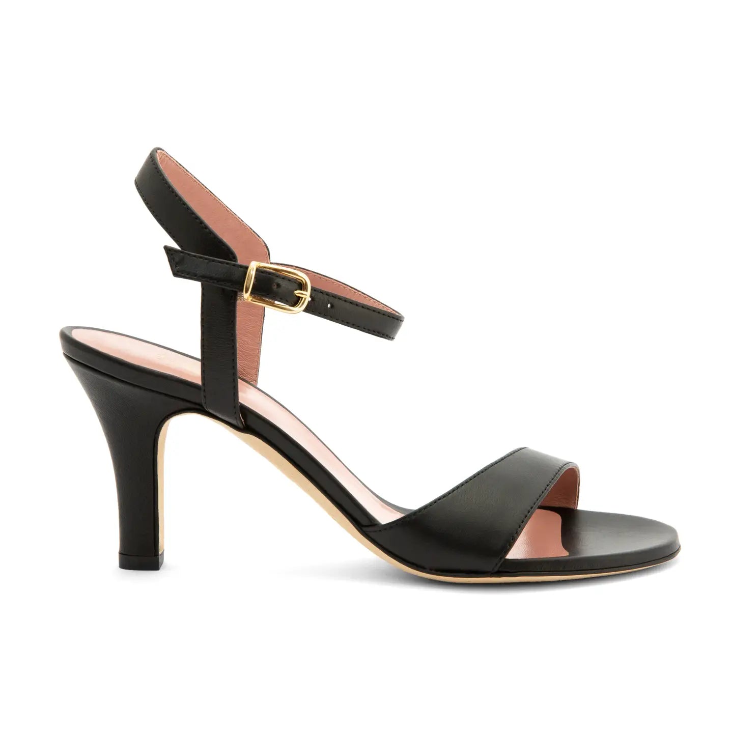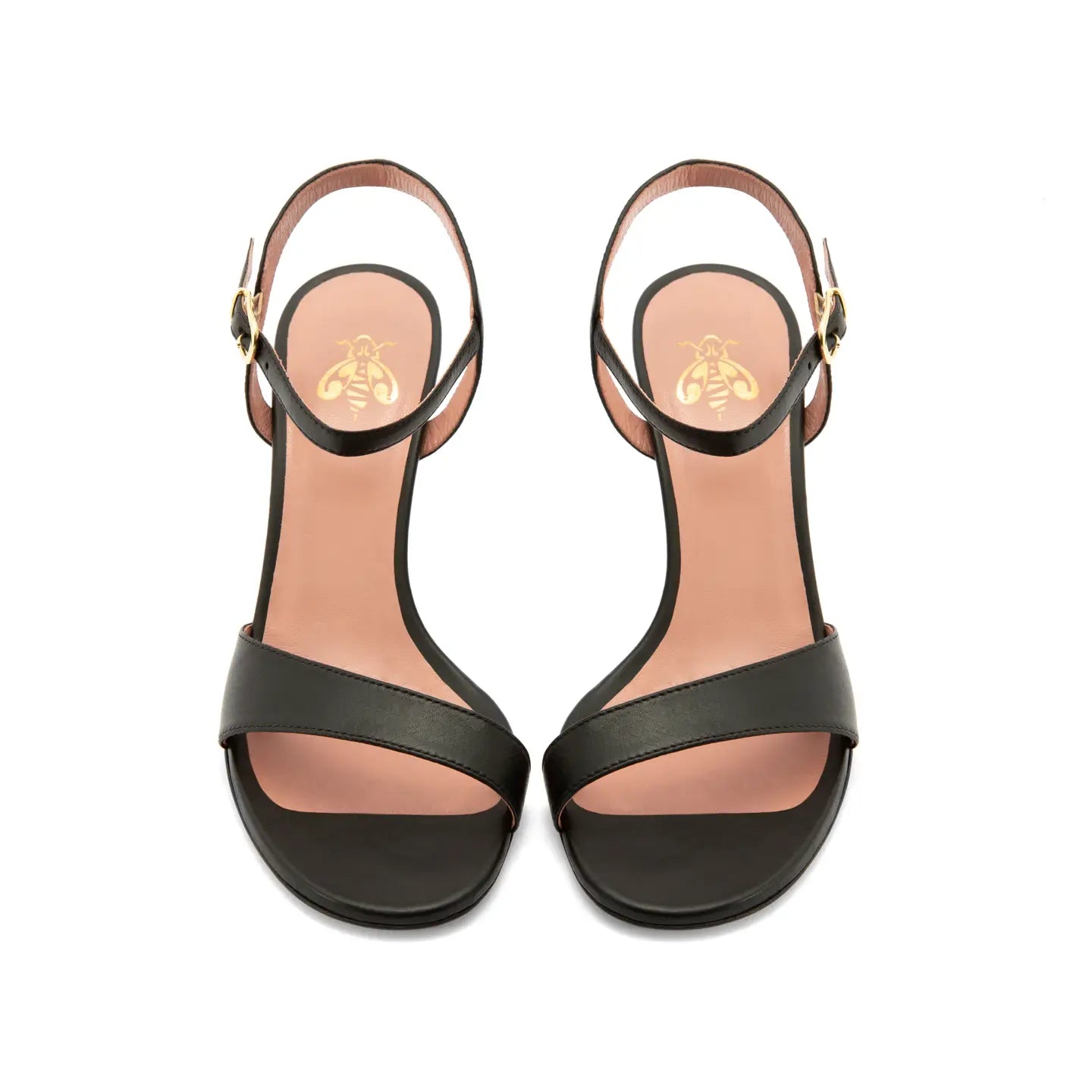 Sumérgete en la sofisticación con nuestra sandalia confeccionada íntegramente en suave napa negra, complementada con un delicado forro rosa antiguo que aporta un toque femenino y refinado. La correa al tobillo, cerrada con una hebilla lateral dorada, no solo asegura un ajuste perfecto, sino que también añade un detalle de lujo que eleva cualquier outfit.