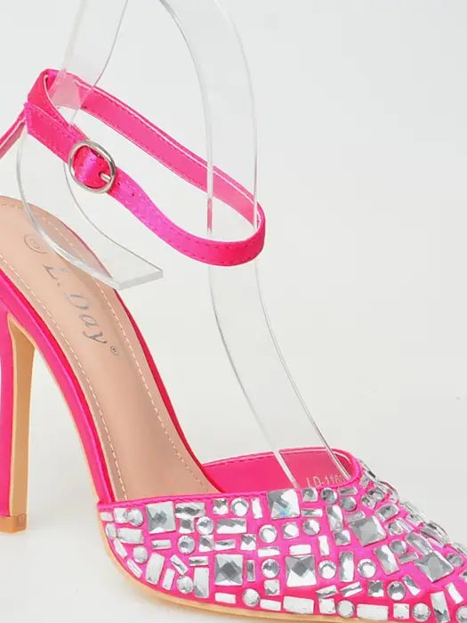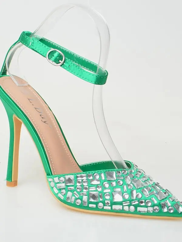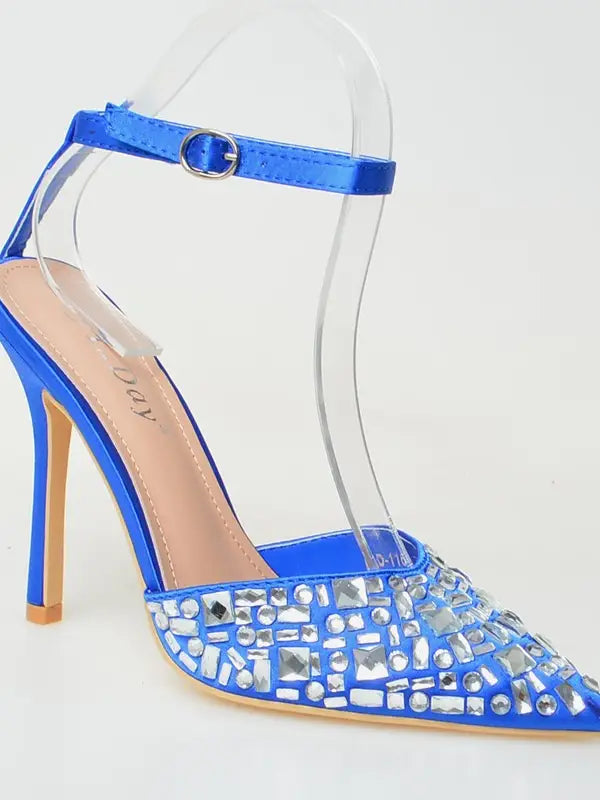 Brilla en cada evento con nuestro estileto de fiesta, hecho en España y disponible en azul, rosa y verde. Su diseño llamativo destaca por la punta fina, tacón alto y cristales de diferentes formas que añaden destellos a cada paso. La pulsera ajustable garantiza sujeción y comodidad, perfecta para largas celebraciones. Elige tu color favorito y eleva tus looks de noche o de fiesta con este calzado único, lleno de glamour y elegancia, pensado para mujeres que aman destacar.