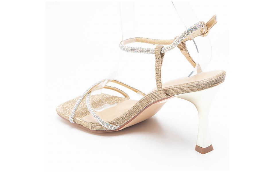 Descubre el zapato de fiesta ideal para brillar en cualquier ocasión especial. Estas sandalias de tacón alto, con un elegante acabado dorado y tiras finas decoradas con brillantes, están diseñadas para realzar tu estilo y aportar sofisticación a tu look. Su tacón de 8 cm estiliza la figura y ofrece la altura perfecta para lucir elegante sin sacrificar comodidad, mientras que la plantilla acolchada garantiza bienestar durante toda la velada.