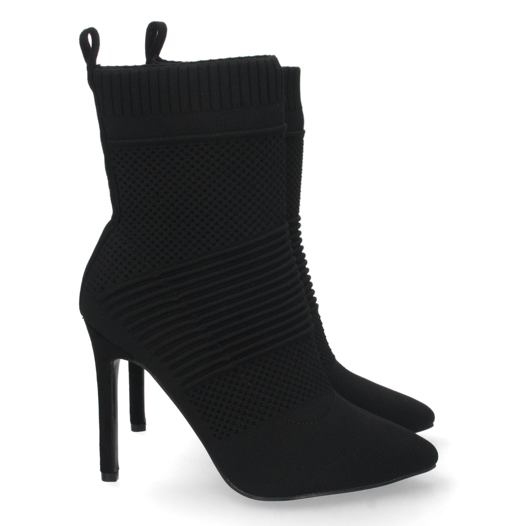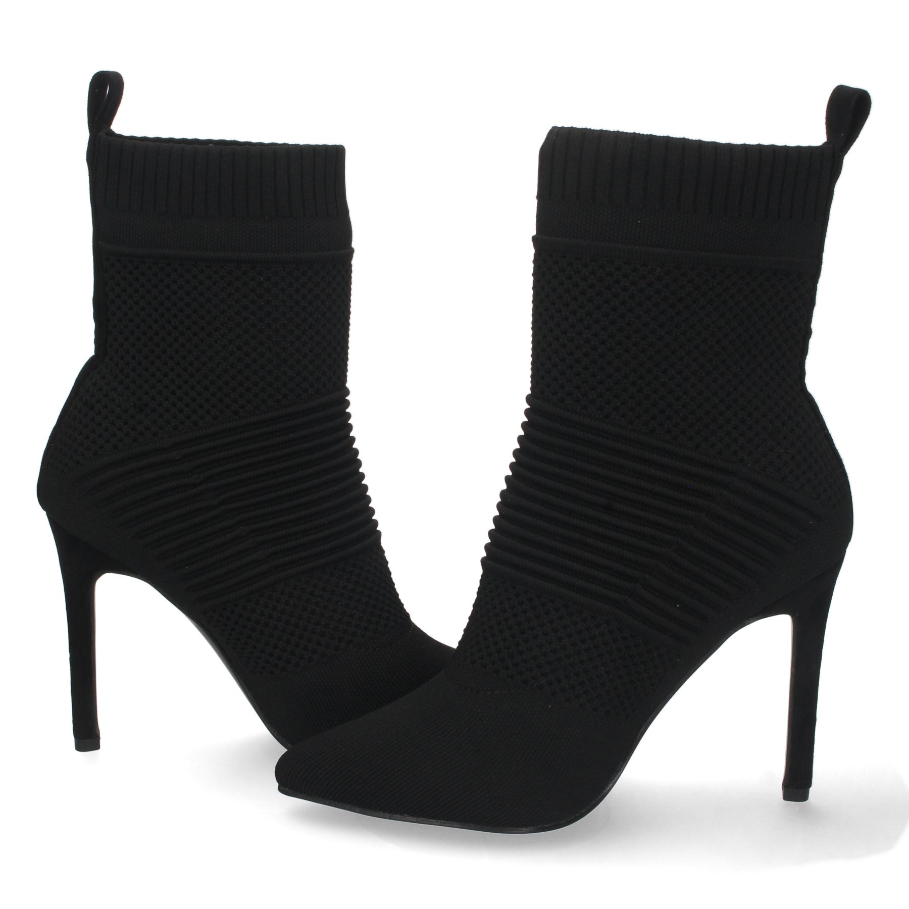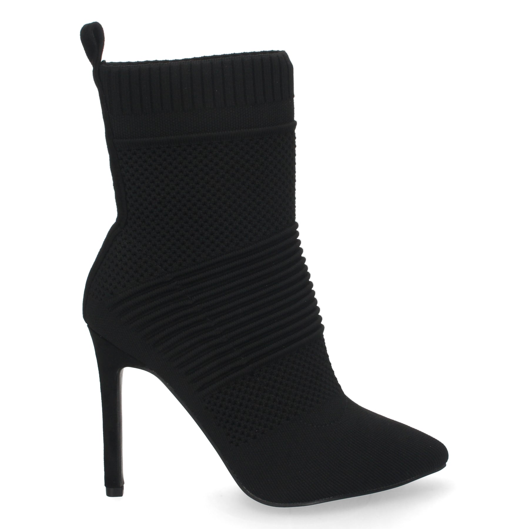Luce sofisticada este otoño-invierno con este botín negro de tacón de aguja y punta fina. Confeccionado en material elástico sin cierre, se ajusta al pie con comodidad. Versátil y elegante, es el complemento ideal para looks casuales o conjuntos más formales.
