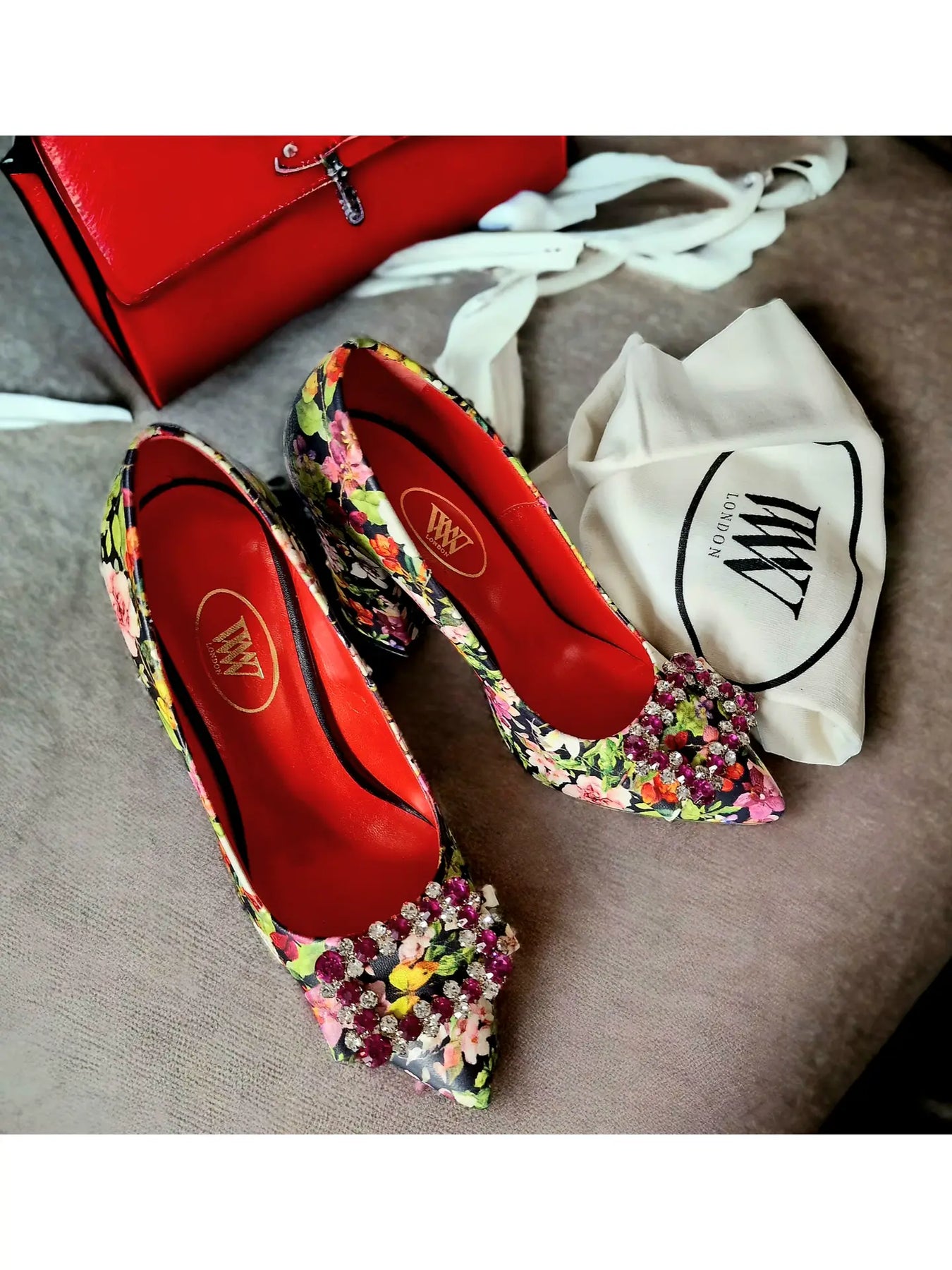 Deslumbra este otoño-invierno con estos elegantes zapatos de tacón, confeccionados en piel y estampado floral multicolor. El toque romántico lo aportan los cristales que decoran la punta, mientras el interior de piel roja envuelve tus pasos de sofisticación. Perfectos para fiestas y eventos diurnos, aportan glamour británico a cada ocasión especial. Hecho en Reino Unido.